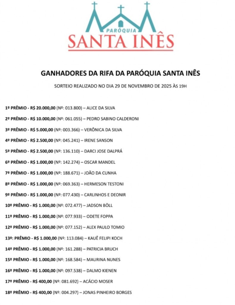 GANHADORES DA RIFA DA PARÓQUIA SANTA INÊS - 2025